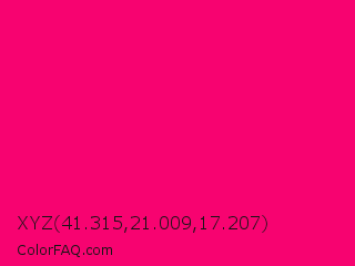 XYZ 41.315,21.009,17.207 Color is a normal rose color and the nearest color is Vivid Raspberry #ff006c. Hex code #f70370 and RGB value is rgb(247,3,112). In RGB color space, this color is composed of 97% red, 1% green, 44% blue, In CMYK color space, this color is composed of 0% cyan, 99% magenta, 55% yellow , 3% black , In HSL color space, this color has a hue angle of 333° , 98% saturation and 49% lightness.
