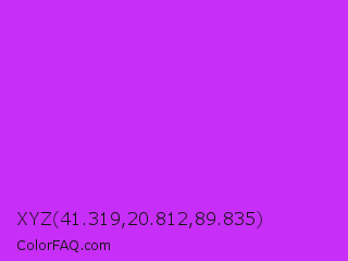 XYZ 41.319,20.812,89.835 Color is a normal purple color and the nearest color is Veronica #a020f0. Hex code #c72ef7 and RGB value is rgb(199,46,247). In RGB color space, this color is composed of 78% red, 18% green, 97% blue, In CMYK color space, this color is composed of 19% cyan, 81% magenta, 0% yellow , 3% black , In HSL color space, this color has a hue angle of 286° , 93% saturation and 57% lightness.