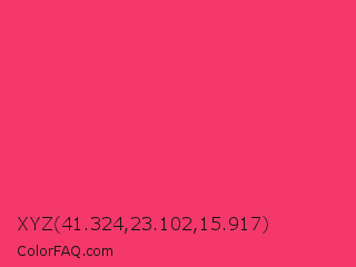 XYZ 41.324,23.102,15.917 Color is a normal rose color and the nearest color is Neon Fuchsia #fe4164. Hex code #f4386a and RGB value is rgb(244,56,106). In RGB color space, this color is composed of 96% red, 22% green, 42% blue, In CMYK color space, this color is composed of 0% cyan, 77% magenta, 57% yellow , 4% black , In HSL color space, this color has a hue angle of 344° , 90% saturation and 59% lightness.