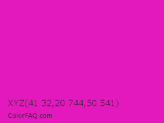 XYZ 41.32,20.744,50.541 Color is a normal magenta color and the nearest color is Shocking Pink #fc0fc0. Hex code #e319be and RGB value is rgb(227,25,190). In RGB color space, this color is composed of 89% red, 10% green, 75% blue, In CMYK color space, this color is composed of 0% cyan, 89% magenta, 16% yellow , 11% black , In HSL color space, this color has a hue angle of 311° , 80% saturation and 49% lightness.