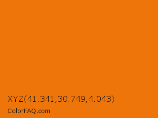 XYZ 41.341,30.749,4.043 Color is a normal orange color and the nearest color is Christine #e7730a. Hex code #ed750a and RGB value is rgb(237,117,10). In RGB color space, this color is composed of 93% red, 46% green, 4% blue, In CMYK color space, this color is composed of 0% cyan, 51% magenta, 96% yellow , 7% black , In HSL color space, this color has a hue angle of 28° , 92% saturation and 48% lightness.