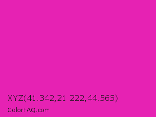 XYZ 41.342,21.222,44.565 Color is a normal magenta color and the nearest color is Frostbite #e936a7. Hex code #e622b3 and RGB value is rgb(230,34,179). In RGB color space, this color is composed of 90% red, 13% green, 70% blue, In CMYK color space, this color is composed of 0% cyan, 85% magenta, 22% yellow , 10% black , In HSL color space, this color has a hue angle of 316° , 80% saturation and 52% lightness.