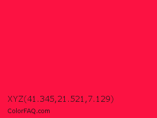XYZ 41.345,21.521,7.129 Color is a normal red color and the nearest color is Torch Red #fd0e35. Hex code #fc1242 and RGB value is rgb(252,18,66). In RGB color space, this color is composed of 99% red, 7% green, 26% blue, In CMYK color space, this color is composed of 0% cyan, 93% magenta, 74% yellow , 1% black , In HSL color space, this color has a hue angle of 348° , 98% saturation and 53% lightness.