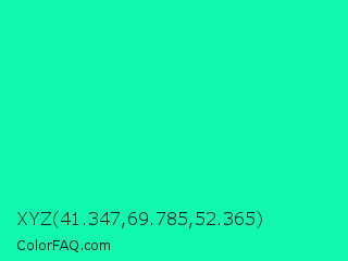 XYZ 41.347,69.785,52.365 Color is a normal green color and the nearest color is Medium Spring Green #00fa9a. Hex code #12f7b0 and RGB value is rgb(18,247,176). In RGB color space, this color is composed of 7% red, 97% green, 69% blue, In CMYK color space, this color is composed of 93% cyan, 0% magenta, 29% yellow , 3% black , In HSL color space, this color has a hue angle of 161° , 93% saturation and 52% lightness.