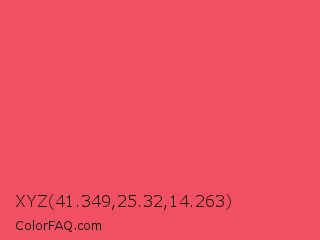 XYZ 41.349,25.32,14.263 Color is a light red color and the nearest color is Carnation #f95a61. Hex code #f15062 and RGB value is rgb(241,80,98). In RGB color space, this color is composed of 95% red, 31% green, 38% blue, In CMYK color space, this color is composed of 0% cyan, 67% magenta, 59% yellow , 5% black , In HSL color space, this color has a hue angle of 353° , 85% saturation and 63% lightness.