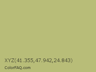 XYZ 41.355,47.942,24.843 Color is a light yellow color and the nearest color is Misty Moss #bbb477. Hex code #b8bd78 and RGB value is rgb(184,189,120). In RGB color space, this color is composed of 72% red, 74% green, 47% blue, In CMYK color space, this color is composed of 3% cyan, 0% magenta, 37% yellow , 26% black , In HSL color space, this color has a hue angle of 64° , 34% saturation and 61% lightness.