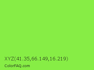 XYZ 41.35,66.149,16.219 Color is a normal green color and the nearest color is Kiwi #8ee53f. Hex code #87ed45 and RGB value is rgb(135,237,69). In RGB color space, this color is composed of 53% red, 93% green, 27% blue, In CMYK color space, this color is composed of 43% cyan, 0% magenta, 71% yellow , 7% black , In HSL color space, this color has a hue angle of 96° , 82% saturation and 60% lightness.