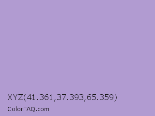 XYZ 41.361,37.393,65.359 Color is a light violet color and the nearest color is Light Pastel Purple #b19cd9. Hex code #b19bd1 and RGB value is rgb(177,155,209). In RGB color space, this color is composed of 69% red, 61% green, 82% blue, In CMYK color space, this color is composed of 15% cyan, 26% magenta, 0% yellow , 18% black , In HSL color space, this color has a hue angle of 264° , 37% saturation and 71% lightness.
