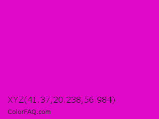 XYZ 41.37,20.238,56.984 Color is a normal magenta color and the nearest color is Deep Magenta #cc00cc. Hex code #e008c9 and RGB value is rgb(224,8,201). In RGB color space, this color is composed of 88% red, 3% green, 79% blue, In CMYK color space, this color is composed of 0% cyan, 96% magenta, 10% yellow , 12% black , In HSL color space, this color has a hue angle of 306° , 93% saturation and 45% lightness.