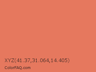 XYZ 41.37,31.064,14.405 Color is a light red color and the nearest color is Terracotta #e2725b. Hex code #e6785e and RGB value is rgb(230,120,94). In RGB color space, this color is composed of 90% red, 47% green, 37% blue, In CMYK color space, this color is composed of 0% cyan, 48% magenta, 59% yellow , 10% black , In HSL color space, this color has a hue angle of 11° , 73% saturation and 64% lightness.