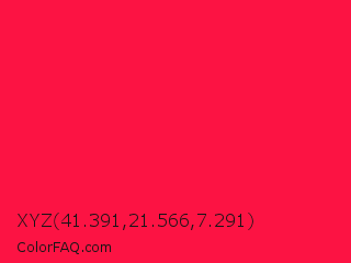 XYZ 41.391,21.566,7.291 Color is a normal red color and the nearest color is Torch Red #fd0e35. Hex code #fc1343 and RGB value is rgb(252,19,67). In RGB color space, this color is composed of 99% red, 7% green, 26% blue, In CMYK color space, this color is composed of 0% cyan, 92% magenta, 73% yellow , 1% black , In HSL color space, this color has a hue angle of 348° , 97% saturation and 53% lightness.