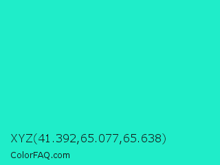 XYZ 41.392,65.077,65.638 Color is a normal cyan color and the nearest color is Turquoise PWG #30d5c8. Hex code #1fedc9 and RGB value is rgb(31,237,201). In RGB color space, this color is composed of 12% red, 93% green, 79% blue, In CMYK color space, this color is composed of 87% cyan, 0% magenta, 15% yellow , 7% black , In HSL color space, this color has a hue angle of 170° , 85% saturation and 53% lightness.