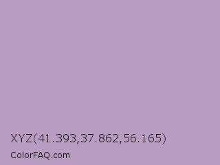 XYZ 41.393,37.862,56.165 Color is a light purple color and the nearest color is London Hue #bea6c3. Hex code #b89cc2 and RGB value is rgb(184,156,194). In RGB color space, this color is composed of 72% red, 61% green, 76% blue, In CMYK color space, this color is composed of 5% cyan, 20% magenta, 0% yellow , 24% black , In HSL color space, this color has a hue angle of 284° , 24% saturation and 69% lightness.