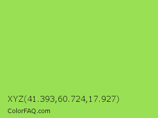 XYZ 41.393,60.724,17.927 Color is a normal green color and the nearest color is Conifer #acdd4d. Hex code #99e054 and RGB value is rgb(153,224,84). In RGB color space, this color is composed of 60% red, 88% green, 33% blue, In CMYK color space, this color is composed of 32% cyan, 0% magenta, 63% yellow , 12% black , In HSL color space, this color has a hue angle of 90° , 69% saturation and 60% lightness.