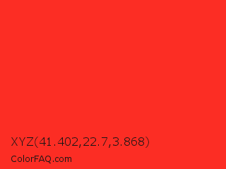 XYZ 41.402,22.7,3.868 Color is a normal red color and the nearest color is Red RYB #fe2712. Hex code #fc2d24 and RGB value is rgb(252,45,36). In RGB color space, this color is composed of 99% red, 18% green, 14% blue, In CMYK color space, this color is composed of 0% cyan, 82% magenta, 86% yellow , 1% black , In HSL color space, this color has a hue angle of 3° , 97% saturation and 56% lightness.