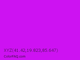 XYZ 41.42,19.823,85.647 Color is a normal purple color and the nearest color is Vivid Orchid #cc00ff. Hex code #cd12f2 and RGB value is rgb(205,18,242). In RGB color space, this color is composed of 80% red, 7% green, 95% blue, In CMYK color space, this color is composed of 15% cyan, 93% magenta, 0% yellow , 5% black , In HSL color space, this color has a hue angle of 290° , 90% saturation and 51% lightness.