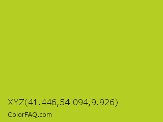 XYZ 41.446,54.094,9.926 Color is a normal yellow color and the nearest color is Key Lime Pie #bfc921. Hex code #b5ce24 and RGB value is rgb(181,206,36). In RGB color space, this color is composed of 71% red, 81% green, 14% blue, In CMYK color space, this color is composed of 12% cyan, 0% magenta, 83% yellow , 19% black , In HSL color space, this color has a hue angle of 69° , 70% saturation and 47% lightness.