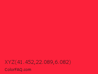 XYZ 41.452,22.089,6.082 Color is a normal red color and the nearest color is Imperial Red #ed2939. Hex code #fc213a and RGB value is rgb(252,33,58). In RGB color space, this color is composed of 99% red, 13% green, 23% blue, In CMYK color space, this color is composed of 0% cyan, 87% magenta, 77% yellow , 1% black , In HSL color space, this color has a hue angle of 353° , 97% saturation and 56% lightness.