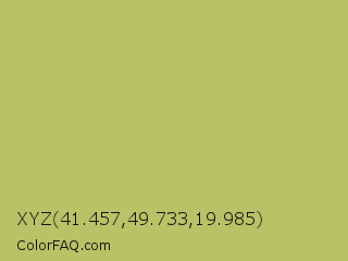 XYZ 41.457,49.733,19.985 Color is a normal yellow color and the nearest color is Wild Willow #b9c46a. Hex code #b8c266 and RGB value is rgb(184,194,102). In RGB color space, this color is composed of 72% red, 76% green, 40% blue, In CMYK color space, this color is composed of 5% cyan, 0% magenta, 47% yellow , 24% black , In HSL color space, this color has a hue angle of 67° , 43% saturation and 58% lightness.
