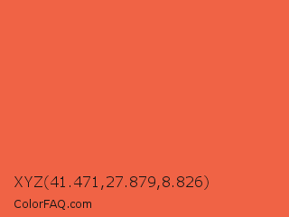 XYZ 41.471,27.879,8.826 Color is a light red color and the nearest color is Orange Soda #fa5b3d. Hex code #f06345 and RGB value is rgb(240,99,69). In RGB color space, this color is composed of 94% red, 39% green, 27% blue, In CMYK color space, this color is composed of 0% cyan, 59% magenta, 71% yellow , 6% black , In HSL color space, this color has a hue angle of 11° , 85% saturation and 61% lightness.