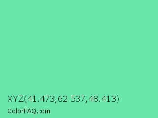 XYZ 41.473,62.537,48.413 Color is a light green color and the nearest color is Medium Aquamarine #66ddaa. Hex code #69e6ab and RGB value is rgb(105,230,171). In RGB color space, this color is composed of 41% red, 90% green, 67% blue, In CMYK color space, this color is composed of 54% cyan, 0% magenta, 26% yellow , 10% black , In HSL color space, this color has a hue angle of 152° , 71% saturation and 66% lightness.