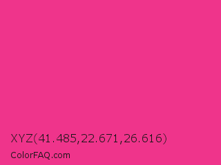 XYZ 41.485,22.671,26.616 Color is a normal rose color and the nearest color is Cerise Pink #ec3b83. Hex code #ef348b and RGB value is rgb(239,52,139). In RGB color space, this color is composed of 94% red, 20% green, 55% blue, In CMYK color space, this color is composed of 0% cyan, 78% magenta, 42% yellow , 6% black , In HSL color space, this color has a hue angle of 332° , 85% saturation and 57% lightness.