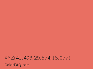XYZ 41.493,29.574,15.077 Color is a light red color and the nearest color is Terracotta #e2725b. Hex code #e96f62 and RGB value is rgb(233,111,98). In RGB color space, this color is composed of 91% red, 44% green, 38% blue, In CMYK color space, this color is composed of 0% cyan, 52% magenta, 58% yellow , 9% black , In HSL color space, this color has a hue angle of 6° , 75% saturation and 65% lightness.