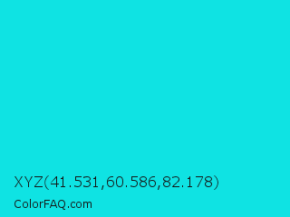 XYZ 41.531,60.586,82.178 Color is a normal cyan color and the nearest color is Bright Turquoise #08e8de. Hex code #0fe3e3 and RGB value is rgb(15,227,227). In RGB color space, this color is composed of 6% red, 89% green, 89% blue, In CMYK color space, this color is composed of 93% cyan, 0% magenta, 0% yellow , 11% black , In HSL color space, this color has a hue angle of 180° , 88% saturation and 47% lightness.