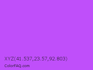 XYZ 41.537,23.57,92.803 Color is a light purple color and the nearest color is Medium Orchid #ba55d3. Hex code #bf4ffa and RGB value is rgb(191,79,250). In RGB color space, this color is composed of 75% red, 31% green, 98% blue, In CMYK color space, this color is composed of 24% cyan, 68% magenta, 0% yellow , 2% black , In HSL color space, this color has a hue angle of 279° , 94% saturation and 65% lightness.