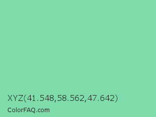 XYZ 41.548,58.562,47.642 Color is a light green color and the nearest color is Vista Blue #8fd6b4. Hex code #7edcab and RGB value is rgb(126,220,171). In RGB color space, this color is composed of 49% red, 86% green, 67% blue, In CMYK color space, this color is composed of 43% cyan, 0% magenta, 22% yellow , 14% black , In HSL color space, this color has a hue angle of 149° , 57% saturation and 68% lightness.