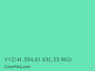 XYZ 41.554,61.631,53.962 Color is a light green color and the nearest color is Medium Aquamarine #66ddaa. Hex code #65e4b6 and RGB value is rgb(101,228,182). In RGB color space, this color is composed of 40% red, 89% green, 71% blue, In CMYK color space, this color is composed of 56% cyan, 0% magenta, 20% yellow , 11% black , In HSL color space, this color has a hue angle of 158° , 70% saturation and 65% lightness.