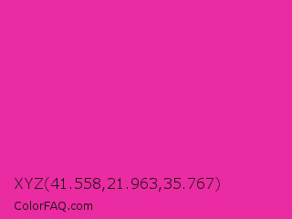 XYZ 41.558,21.963,35.767 Color is a normal magenta color and the nearest color is Frostbite #e936a7. Hex code #eb2ba1 and RGB value is rgb(235,43,161). In RGB color space, this color is composed of 92% red, 17% green, 63% blue, In CMYK color space, this color is composed of 0% cyan, 82% magenta, 31% yellow , 8% black , In HSL color space, this color has a hue angle of 323° , 83% saturation and 55% lightness.