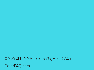 XYZ 41.558,56.576,85.074 Color is a normal cyan color and the nearest color is Turquoise #40e0d0. Hex code #41d9e8 and RGB value is rgb(65,217,232). In RGB color space, this color is composed of 25% red, 85% green, 91% blue, In CMYK color space, this color is composed of 72% cyan, 6% magenta, 0% yellow , 9% black , In HSL color space, this color has a hue angle of 185° , 78% saturation and 58% lightness.