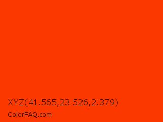 XYZ 41.565,23.526,2.379 Color is a normal red color and the nearest color is Coquelicot #ff3800. Hex code #fc3801 and RGB value is rgb(252,56,1). In RGB color space, this color is composed of 99% red, 22% green, 0% blue, In CMYK color space, this color is composed of 0% cyan, 78% magenta, 100% yellow , 1% black , In HSL color space, this color has a hue angle of 13° , 99% saturation and 50% lightness.