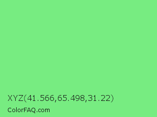 XYZ 41.566,65.498,31.22 Color is a light green color and the nearest color is Pastel Green #77dd77. Hex code #77ec81 and RGB value is rgb(119,236,129). In RGB color space, this color is composed of 47% red, 93% green, 51% blue, In CMYK color space, this color is composed of 50% cyan, 0% magenta, 45% yellow , 7% black , In HSL color space, this color has a hue angle of 125° , 75% saturation and 70% lightness.