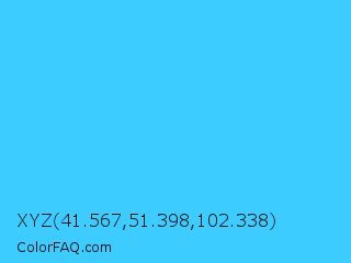 XYZ 41.567,51.398,102.338 Color is a light blue color and the nearest color is Picton Blue #45b1e8. Hex code #3dccff and RGB value is rgb(61,204,255). In RGB color space, this color is composed of 24% red, 80% green, 100% blue, In CMYK color space, this color is composed of 76% cyan, 20% magenta, 0% yellow , 0% black , In HSL color space, this color has a hue angle of 196° , 100% saturation and 62% lightness.