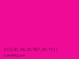 XYZ 41.56,20.967,30.711 Color is a normal magenta color and the nearest color is Hollywood Cerise #f400a1. Hex code #f00b96 and RGB value is rgb(240,11,150). In RGB color space, this color is composed of 94% red, 4% green, 59% blue, In CMYK color space, this color is composed of 0% cyan, 95% magenta, 38% yellow , 6% black , In HSL color space, this color has a hue angle of 324° , 91% saturation and 49% lightness.