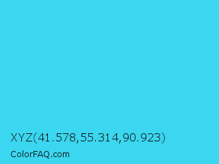 XYZ 41.578,55.314,90.923 Color is a normal cyan color and the nearest color is Turquoise #40e0d0. Hex code #3bd6f0 and RGB value is rgb(59,214,240). In RGB color space, this color is composed of 23% red, 84% green, 94% blue, In CMYK color space, this color is composed of 75% cyan, 11% magenta, 0% yellow , 6% black , In HSL color space, this color has a hue angle of 189° , 86% saturation and 59% lightness.