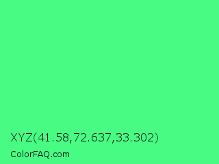 XYZ 41.58,72.637,33.302 Color is a light green color and the nearest color is Very Light Malachite Green #64e986. Hex code #48fc83 and RGB value is rgb(72,252,131). In RGB color space, this color is composed of 28% red, 99% green, 51% blue, In CMYK color space, this color is composed of 71% cyan, 0% magenta, 48% yellow , 1% black , In HSL color space, this color has a hue angle of 140° , 97% saturation and 64% lightness.
