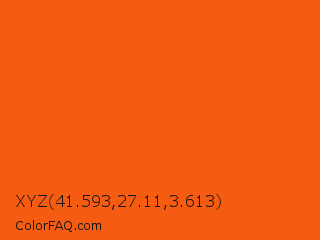 XYZ 41.593,27.11,3.613 Color is a normal orange color and the nearest color is Giants Orange #fe5a1d. Hex code #f55c12 and RGB value is rgb(245,92,18). In RGB color space, this color is composed of 96% red, 36% green, 7% blue, In CMYK color space, this color is composed of 0% cyan, 62% magenta, 93% yellow , 4% black , In HSL color space, this color has a hue angle of 20° , 92% saturation and 52% lightness.