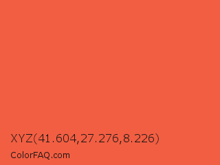 XYZ 41.604,27.276,8.226 Color is a normal red color and the nearest color is Orange Soda #fa5b3d. Hex code #f25e42 and RGB value is rgb(242,94,66). In RGB color space, this color is composed of 95% red, 37% green, 26% blue, In CMYK color space, this color is composed of 0% cyan, 61% magenta, 73% yellow , 5% black , In HSL color space, this color has a hue angle of 10° , 87% saturation and 60% lightness.