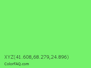 XYZ 41.608,68.279,24.896 Color is a light green color and the nearest color is Screamin Green #66ff66. Hex code #74f26b and RGB value is rgb(116,242,107). In RGB color space, this color is composed of 45% red, 95% green, 42% blue, In CMYK color space, this color is composed of 52% cyan, 0% magenta, 56% yellow , 5% black , In HSL color space, this color has a hue angle of 116° , 84% saturation and 68% lightness.