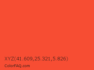 XYZ 41.609,25.321,5.826 Color is a normal red color and the nearest color is Flamingo #f2552a. Hex code #f74d33 and RGB value is rgb(247,77,51). In RGB color space, this color is composed of 97% red, 30% green, 20% blue, In CMYK color space, this color is composed of 0% cyan, 69% magenta, 79% yellow , 3% black , In HSL color space, this color has a hue angle of 8° , 92% saturation and 58% lightness.