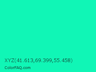 XYZ 41.613,69.399,55.458 Color is a normal green color and the nearest color is Medium Spring Green #00fa9a. Hex code #10f6b6 and RGB value is rgb(16,246,182). In RGB color space, this color is composed of 6% red, 96% green, 71% blue, In CMYK color space, this color is composed of 93% cyan, 0% magenta, 26% yellow , 4% black , In HSL color space, this color has a hue angle of 163° , 93% saturation and 51% lightness.