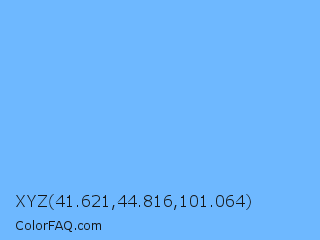 XYZ 41.621,44.816,101.064 Color is a light blue color and the nearest color is Very Light Azure #74bbfb. Hex code #6eb8ff and RGB value is rgb(110,184,255). In RGB color space, this color is composed of 43% red, 72% green, 100% blue, In CMYK color space, this color is composed of 57% cyan, 28% magenta, 0% yellow , 0% black , In HSL color space, this color has a hue angle of 209° , 100% saturation and 72% lightness.