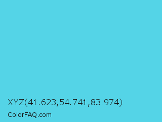 XYZ 41.623,54.741,83.974 Color is a light cyan color and the nearest color is Viking #64ccdb. Hex code #54d4e7 and RGB value is rgb(84,212,231). In RGB color space, this color is composed of 33% red, 83% green, 91% blue, In CMYK color space, this color is composed of 64% cyan, 8% magenta, 0% yellow , 9% black , In HSL color space, this color has a hue angle of 188° , 75% saturation and 62% lightness.