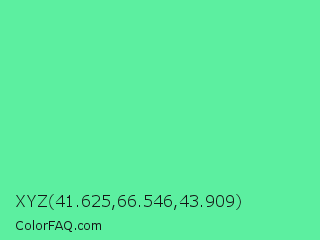 XYZ 41.625,66.546,43.909 Color is a light green color and the nearest color is Medium Aquamarine #66ddaa. Hex code #5cefa0 and RGB value is rgb(92,239,160). In RGB color space, this color is composed of 36% red, 94% green, 63% blue, In CMYK color space, this color is composed of 62% cyan, 0% magenta, 33% yellow , 6% black , In HSL color space, this color has a hue angle of 148° , 82% saturation and 65% lightness.