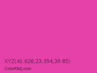 XYZ 41.628,23.354,39.85 Color is a normal magenta color and the nearest color is Frostbite #e936a7. Hex code #e640a9 and RGB value is rgb(230,64,169). In RGB color space, this color is composed of 90% red, 25% green, 66% blue, In CMYK color space, this color is composed of 0% cyan, 72% magenta, 27% yellow , 10% black , In HSL color space, this color has a hue angle of 322° , 77% saturation and 58% lightness.