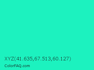 XYZ 41.635,67.513,60.127 Color is a normal cyan color and the nearest color is Turquoise PWG #30d5c8. Hex code #1cf2bf and RGB value is rgb(28,242,191). In RGB color space, this color is composed of 11% red, 95% green, 75% blue, In CMYK color space, this color is composed of 88% cyan, 0% magenta, 21% yellow , 5% black , In HSL color space, this color has a hue angle of 166° , 89% saturation and 53% lightness.