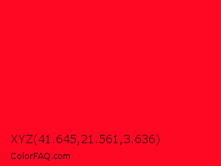 XYZ 41.645,21.561,3.636 Color is a normal red color and the nearest color is Ruddy #ff0028. Hex code #ff0824 and RGB value is rgb(255,8,36). In RGB color space, this color is composed of 100% red, 3% green, 14% blue, In CMYK color space, this color is composed of 0% cyan, 97% magenta, 86% yellow , 0% black , In HSL color space, this color has a hue angle of 353° , 100% saturation and 52% lightness.